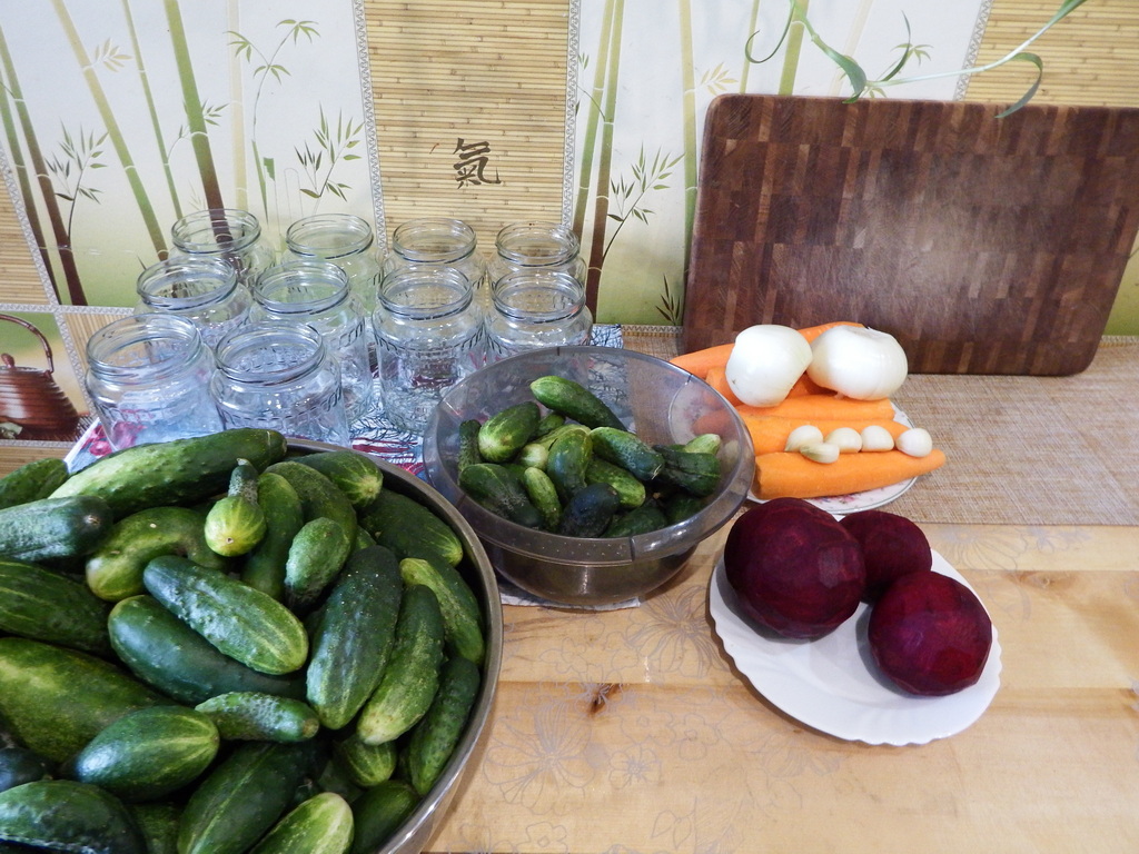 Помоем огурцы, почистим лук и морковь. Таким же рецептом можно подготовить и свеклу и если есть желание и время сделать все одним разом, то почистите и свеклу.
