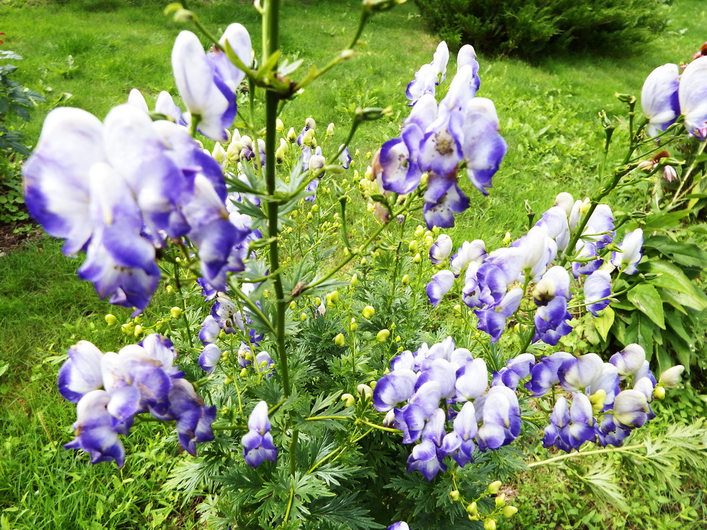 Везде пишут, что Акониты ядовитые растения. Может это и так, но вот от соприкосновения с ними я не получаю ни каких либо ожогов, или других недугов. Вся ядовитость этого растения спрятана в корневой системе. Да и растет он у меня вдалеке от дома, на участке с газоном, так что почти никаких с ним контактов.